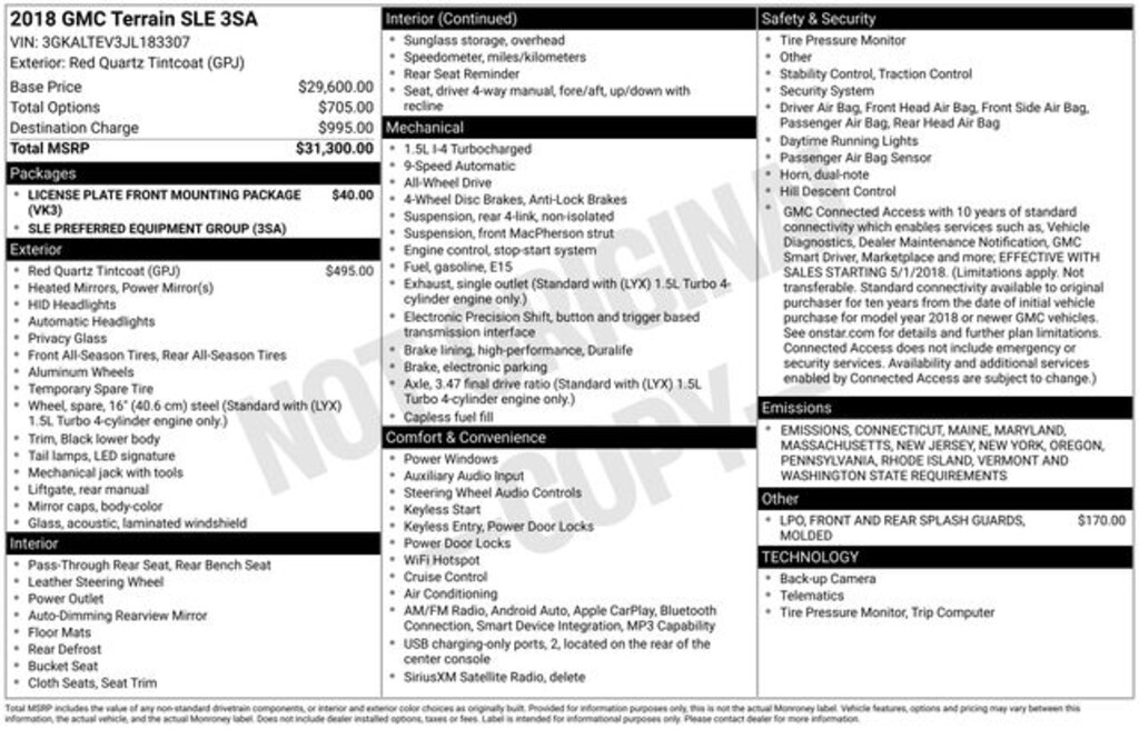 Key Chrysler Dodge Jeep Ram Newcastle is proud to present you with another True Market Priced Pre-Owned Vehicle. Transparent Pricing Of $ !! This 2018 GMC Terrain SLE is loaded with the following Factory Options: AWD License Plate Front Mounting Package, Preferred Equipment Group 3SA, AWD, 2 USB Data Ports w/Auxiliary Input Jack, 3.47 Axle Ratio, 4-Way Manual Driver's Seat, 4-Way Manual Front Passenger Seat, 4-Wheel Disc Brakes, 6 Speakers, 6-Speaker Audio System Feature, ABS brakes, Air Conditioning, Alloy wheels, AM/FM radio, Apple CarPlay/Android Auto, Auto-dimming Rear-View mirror, Bluetooth® For Phone, Brake assist, Bumpers: body-color, Compass, Delay-off headlights, Driver door bin, Driver vanity mirror, Dual front impact airbags, Dual front side impact airbags, Electronic Stability Control, Emergency communication system: OnStar Guidance, Exterior Parking Camera Rear, Four wheel independent suspension, Front & Rear Molded Splash Guards, Front anti-roll bar, Front Bucket Seats, Front Center Armrest, Front reading lights, Fully automatic headlights, Heated door mirrors, High-Intensity Discharge Headlights, Illuminated entry, Low tire pressure warning, Occupant sensing airbag, Outside temperature display, Overhead airbag, Overhead console, Panic alarm, Passenger door bin, Passenger vanity mirror, Power door mirrors, Power steering, Power windows, Premium Cloth Seat Trim, Radio data system, Radio: GMC Infotainment Audio System w/7" Display, Rear anti-roll bar, Rear seat center armrest, Rear window defroster, Rear window wiper, Remote keyless entry, Security system, Speed control, Speed-sensing steering, Split folding rear seat, Spoiler, Steering wheel mounted audio controls, Tachometer, Telescoping steering wheel, Tilt steering wheel, Traction control, Trip computer, Variably intermittent wipers, and Wheels: 17" x 7" Silver Painted Aluminum!!