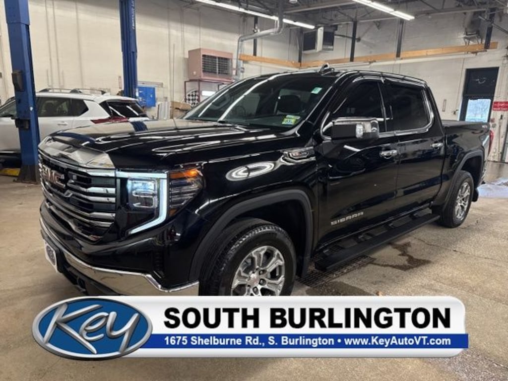Key Chevrolet Burlington is proud to present you with another True Market Priced Pre-Owned Vehicle. Transparent Pricing Of $ 46999 !! This 2023 GMC Sierra 1500 SLT is loaded with the following Factory Options: 10-Speed Automatic, 4WD, and Black Leather Max Trailering Package (Enhanced Cooling Radiator, Heavier Duty Rear Springs, and Increased RGAWR), Preferred Equipment Group 4SA (120-Volt Bed Mounted Power Outlet, 120-Volt Instrument Panel Power Outlet, 170 Amp Alternator, 2 Charge/Data USB Ports, 2 Type-C Charge-Only Rear USB Ports, 6-Speaker Audio System Feature, Auto-Locking Rear Differential, Auxiliary External Transmission Oil Cooler, Chrome Header & Chrome Grille Insert Bars, Color-Keyed Carpeting Floor Covering, Compass, Deep-Tinted Glass, Electric Rear-Window Defogger, Electrical Steering Column Lock, Front Frame-Mounted Black Recovery Hooks, Front Rainsensing Wipers, GMC Connected Access Capable, HD Rear Vision Camera, Keyless Open & Start, LED Cargo Area Lighting, Manual Tilt-Wheel & Telescoping Steering Column, OnStar & GMC Connected Services Capable, Perimeter Lighting, Power Door Locks, Power Front Passenger Windows w/Express Up/Down, Power Front Windows w/Driver Express Up/Down, Power Rear Windows w/Express Down, Push Button Start, Rear Wheelhouse Liners, Remote Vehicle Starter System, SiriusXM w/360L, Steering Wheel Audio Controls, Theft Deterrent System (Unauthorized Entry), Wi-Fi Hotspot Capable, and Wireless Phone Projection), ProGrade Trailering System (Hitch Guidance w/Hitch View, In-Vehicle Trailering App, and Integrated Trailer Brake Controller), SLT Convenience Package (2 Charge/Data USB Ports Inside Center Console, Electronic Precision Shift, Floor-Mounted Center Console, Front Bucket Seats, Power Rake & Telescoping Steering Column, Premium Bose 7-Speaker Sound System, Ventilated Driver & Front Passenger Seats, and Wireless Charging), SLT Preferred Package (Adaptive Cruise Control, Heated 2nd Row Outboard Seats, Power Sliding Rear Window w/Rear Defogger, and Universal Home Remote), Standard Suspension Package, Trailering Package (Hitch Guidance), 10-Speed Automatic, 4WD, Black Leather, 10-Way Power Driver Seat Adjuster w/Lumbar, 10-Way Power Passenger Seat Adjuster w/Lumbar, 220 Amp Alternator, 4-Wheel Disc Brakes, 6 Speakers, ABS brakes, Air Conditioning, Alloy wheels, AM/FM radio, Apple CarPlay/Android Auto, Auto High-beam Headlights, Auto-dimming door mirrors, Auto-dimming Rear-View mirror, Automatic Emergency Braking, Automatic temperature control, Brake assist, Buckle to Drive, Bumpers: chrome, Delay-off headlights, Driver door bin, Driver Memory, Driver vanity mirror, Dual Exhaust System, Dual front impact airbags, Dual front side impact airbags, Electronic Stability Control, Emergency communication system: OnStar and GMC connected services capable, Following Distance Indicator, Forward Collision Alert, Front 40/20/40 Split-Bench Seat, Front anti-roll bar, Front Center Armrest w/Storage, Front dual zone A/C, Front fog lights, Front License Plate Kit, Front Pedestrian Braking, Front reading lights, Front wheel independent suspension, Fully automatic headlights, Heated door mirrors, Heated Driver & Front Outboard Passenger Seating, Heated front seats, Heated steering wheel, Illuminated entry, IntelliBeam Automatic High Beam On/Off, Lane Keep Assist w/Lane Departure Warning, Low tire pressure warning, Memory seat, Navigation System, Not Equipped w/Steering Column Lo