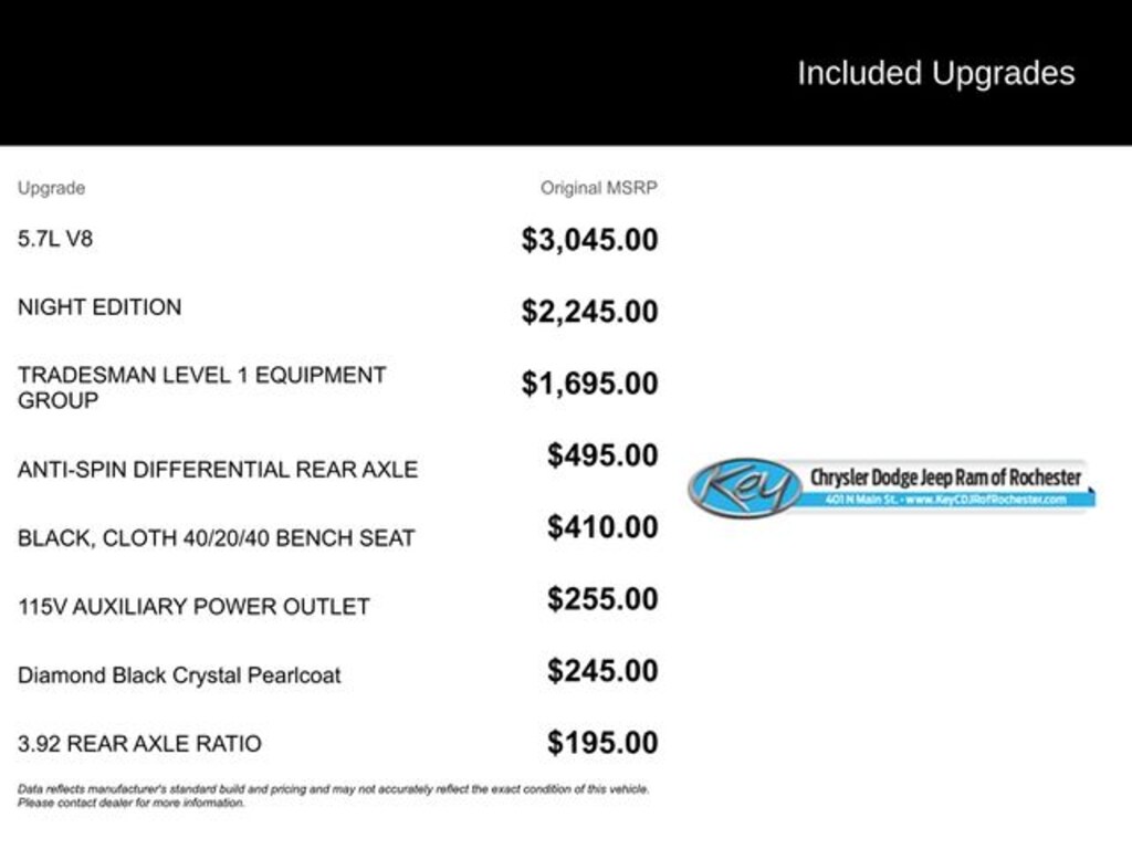 Key Chrysler Dodge Jeep Ram of Rochester is proud to present you with another True Market Priced Pre-Owned Vehicle. Transparent Pricing Of $ !! This 2024 Ram 1500 Tradesman is loaded with the following Factory Options: Night Edition (3 Rear Seat Head Restraints, 4 Way Front Headrests, 40/20/40 Split Bench Seat, Anti-Spin Differential Rear Axle, Black Exterior Truck Badging, Black Interior Accents, Body Color Front Bumper, Body Color Rear Bumper w/Step Pads, Carpet Floor Covering, Cloth 40/20/40 Bench Seat, Front & Rear Floor Mats, Front Center Seat Cushion Storage, Front Fog Lamps, Grille Black Surround Black Mesh, Manual Adjust 4-Way Driver Seat, Manual Adjust 4-Way Front Passenger Seat, RAM Grille Badge - Black, Rear Folding Seat, and Wheels: 20" x 9" Cast Aluminum Black), Quick Order Package 27A Tradesman, Tradesman Level 1 Equipment Group (2nd Row In Floor Storage Bins, For More Info, Call 800-643-2112, Rear Power Sliding Window, SiriusXM Radio Service, and SiriusXM Satellite Radio), 4-Wheel Disc Brakes, 48V Belt Starter Generator, 6 Speakers, ABS brakes, Air Conditioning, AM/FM radio, Brake assist, Compass, Delay-off headlights, Driver door bin, Dual front impact airbags, Dual front side impact airbags, Electronic Stability Control, Emergency communication system: RAM Connect, Exterior Mirrors w/Heating Element, For Details, Visit DriveUconnect.com, Front anti-roll bar, Front Center Armrest, Front License Plate Bracket, Front reading lights, Front wheel independent suspension, Fully automatic headlights, Global Telematics Box Module (TBM), Heated door mirrors, Heavy Duty Vinyl 40/20/40 Split Bench Seat, Illuminated entry, Low tire pressure warning, Occupant sensing airbag, Outside temperature display, Overhead airbag, Overhead console, Panic alarm, ParkView Rear Back-Up Camera, Passenger door bin, Passenger vanity mirror, Power door mirrors, Power steering, Power windows, Radio data system, Radio: Uconnect 3 w/5" Display, RAM Grille Badge - Chrome, Rear anti-roll bar, Rear step bumper, Remote keyless entry, Speed control, Tachometer, Telescoping steering wheel, Tilt steering wheel, Traction control, Variably intermittent wipers, Voltmeter, and Wheels: 18" x 7.5" Steel Painted!!